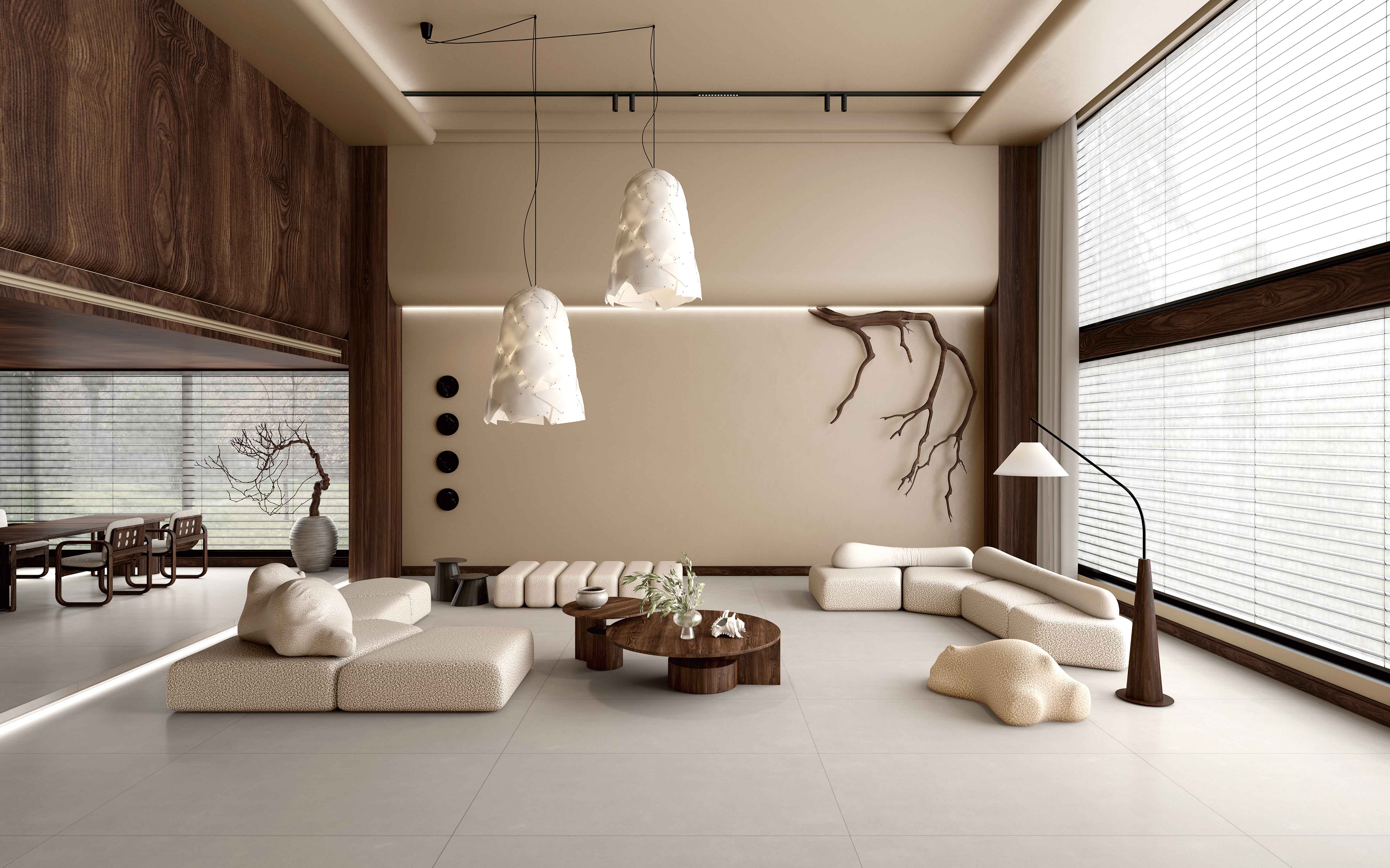靈感源自化繁為簡的素色水泥,延續低飽和度淺卡其色,柔和光澤點點于空間,還一室生活的藝術氛圍,讓空間有著獨特的質感與寧靜感。