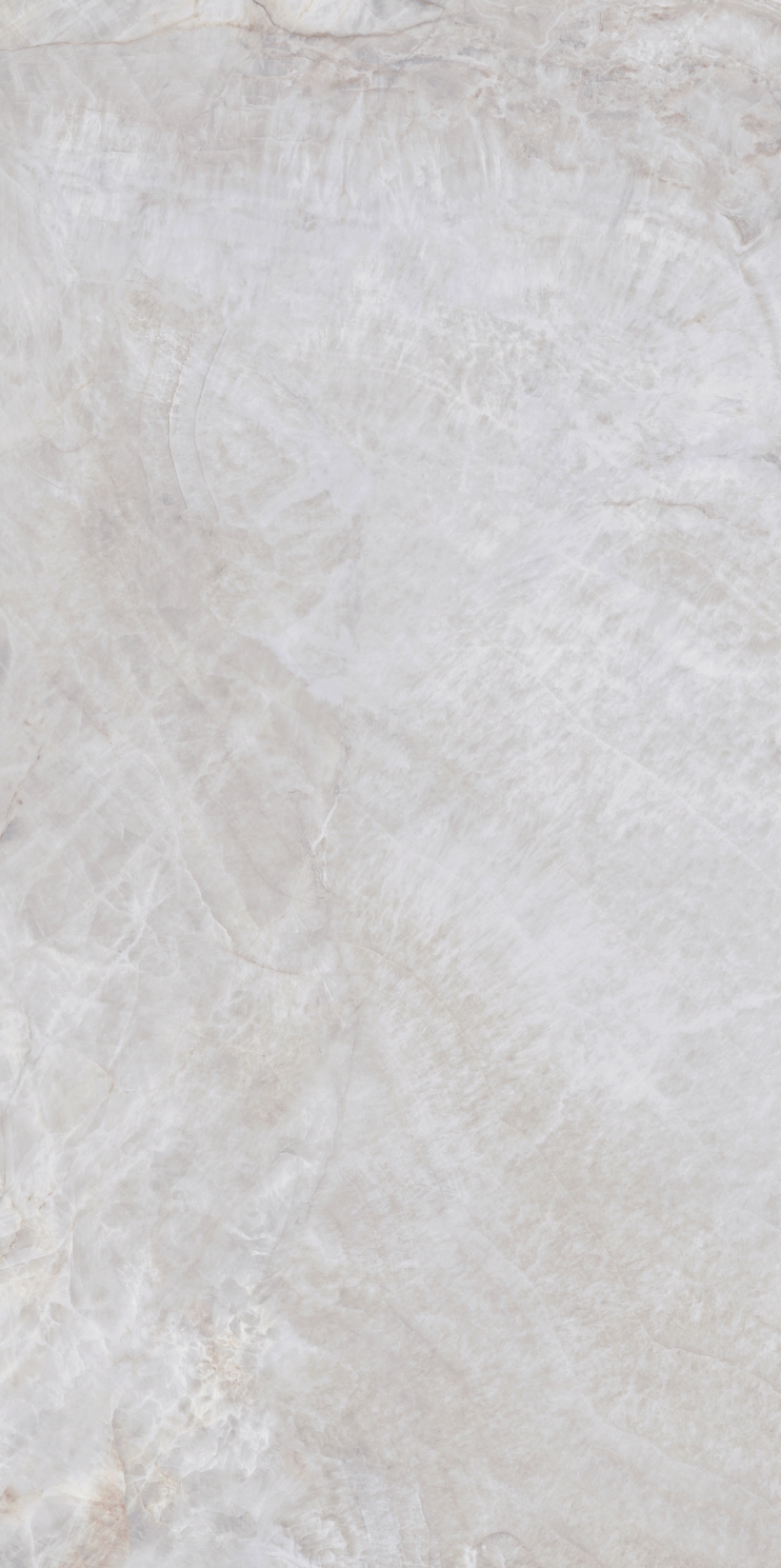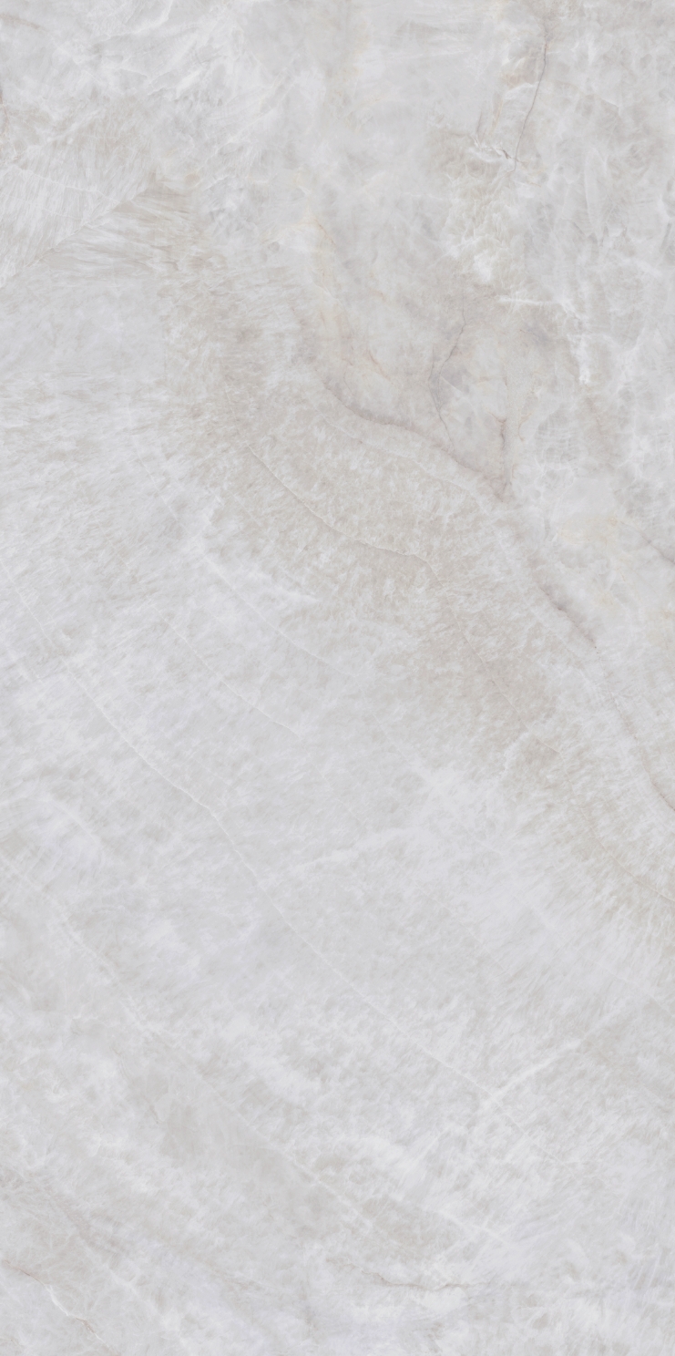 銀灰色的磚面上附著這大片絮狀紋理,形成了絢麗的銀灰色版面,猶如云母貝獨特的生長紋,高透柔美的玉質(zhì)凝脂感和均勻的質(zhì)地,在光線照射下泛起溫婉細膩的虹彩。